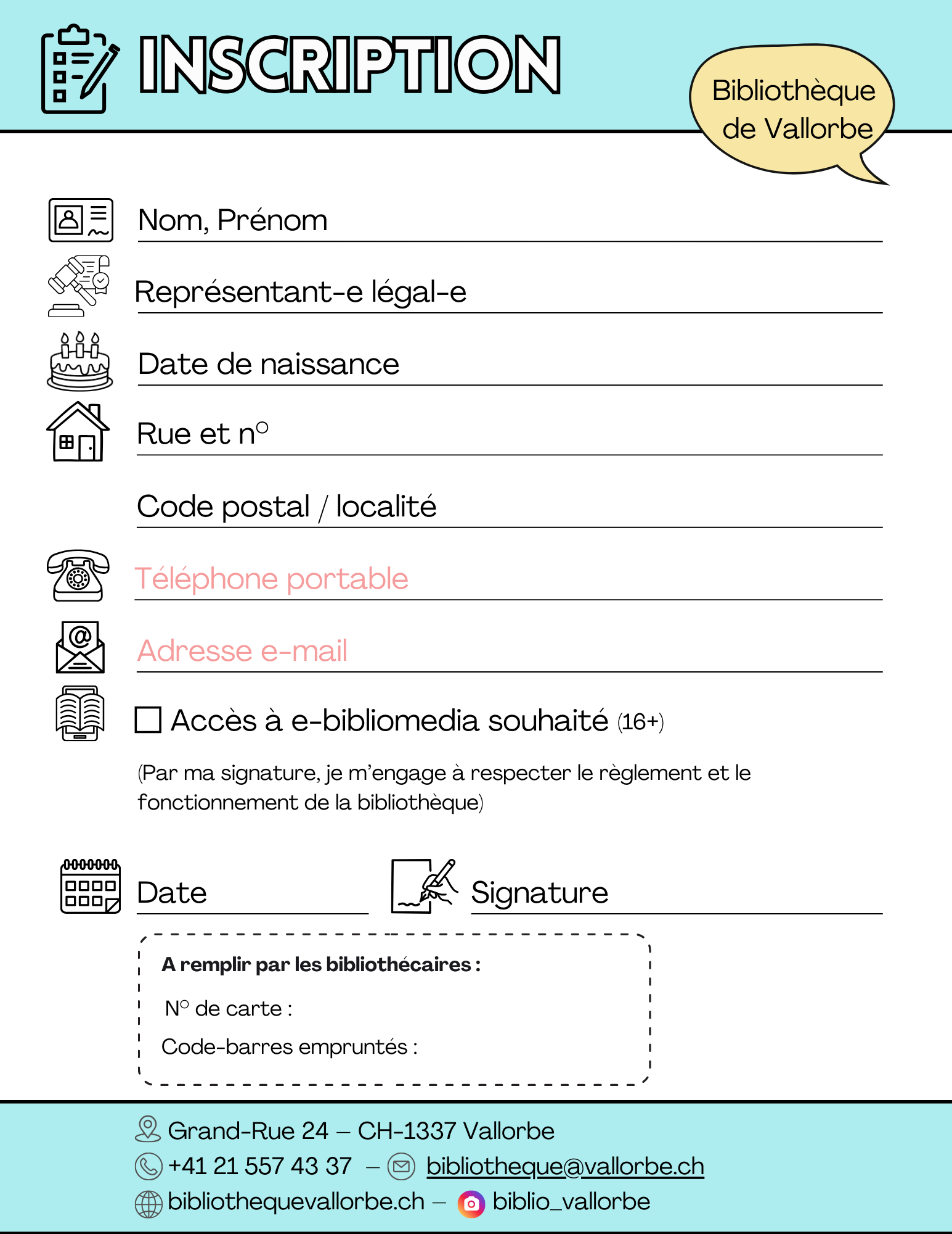 L’inscription se fait via un formulaire ad-hoc. Par sa signature (ou la signature du représentant légal pour les mineur-e-s), l’usager-ère s’engage à respecter le règlement de la bibliothèque.